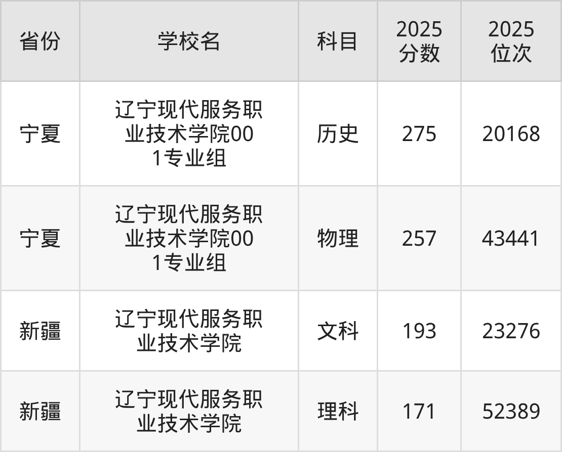 2025年遼寧現(xiàn)代服務(wù)職業(yè)技術(shù)學(xué)院在省內(nèi)分歷史物理科目類錄取,其中歷史類最低分是312分、對應(yīng)位次是49193名;物理類最低分是261分,對應(yīng)位次是140134名。