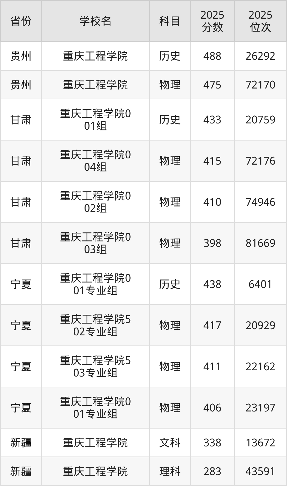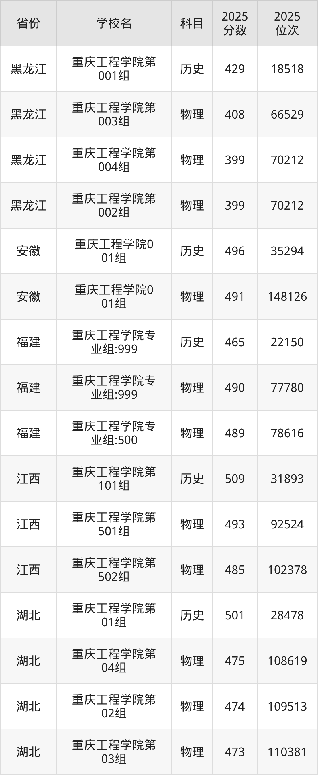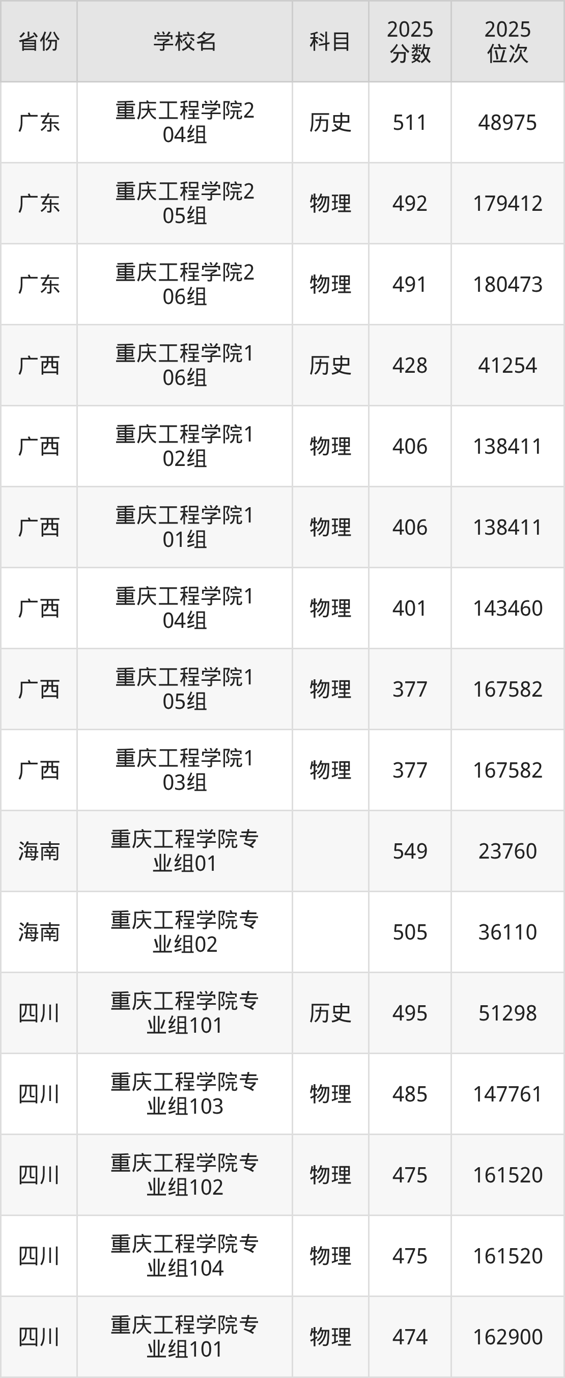 2025年重慶工程學(xué)院歷史類最低分445分(33174名)、物理類最低分425分(103219名)。