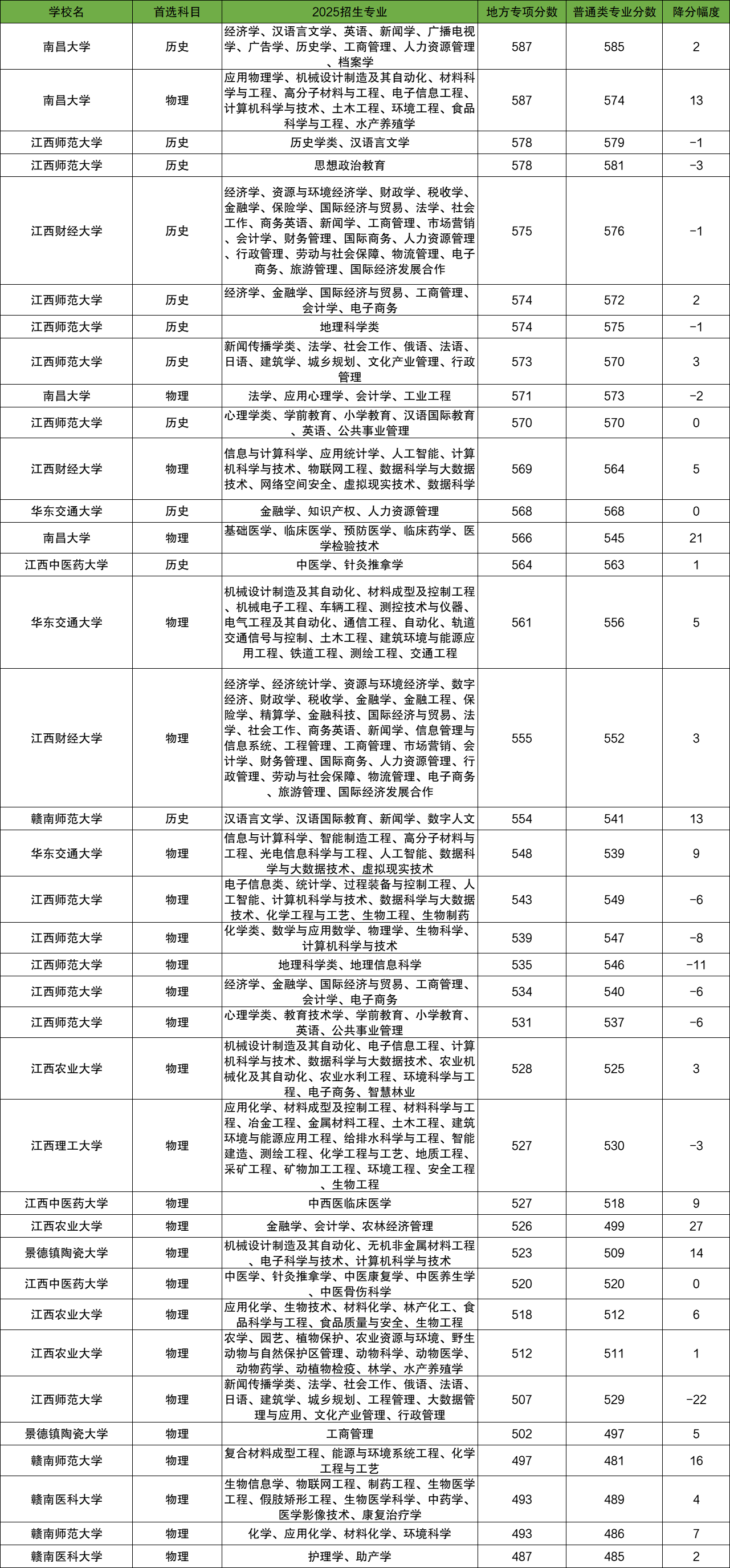 由于篇幅限制,本文同樣以江西2025年的錄取數據為例,整理出2025年江西地方專項計劃院校及專業(yè)的降分表,供2026年考生參考。