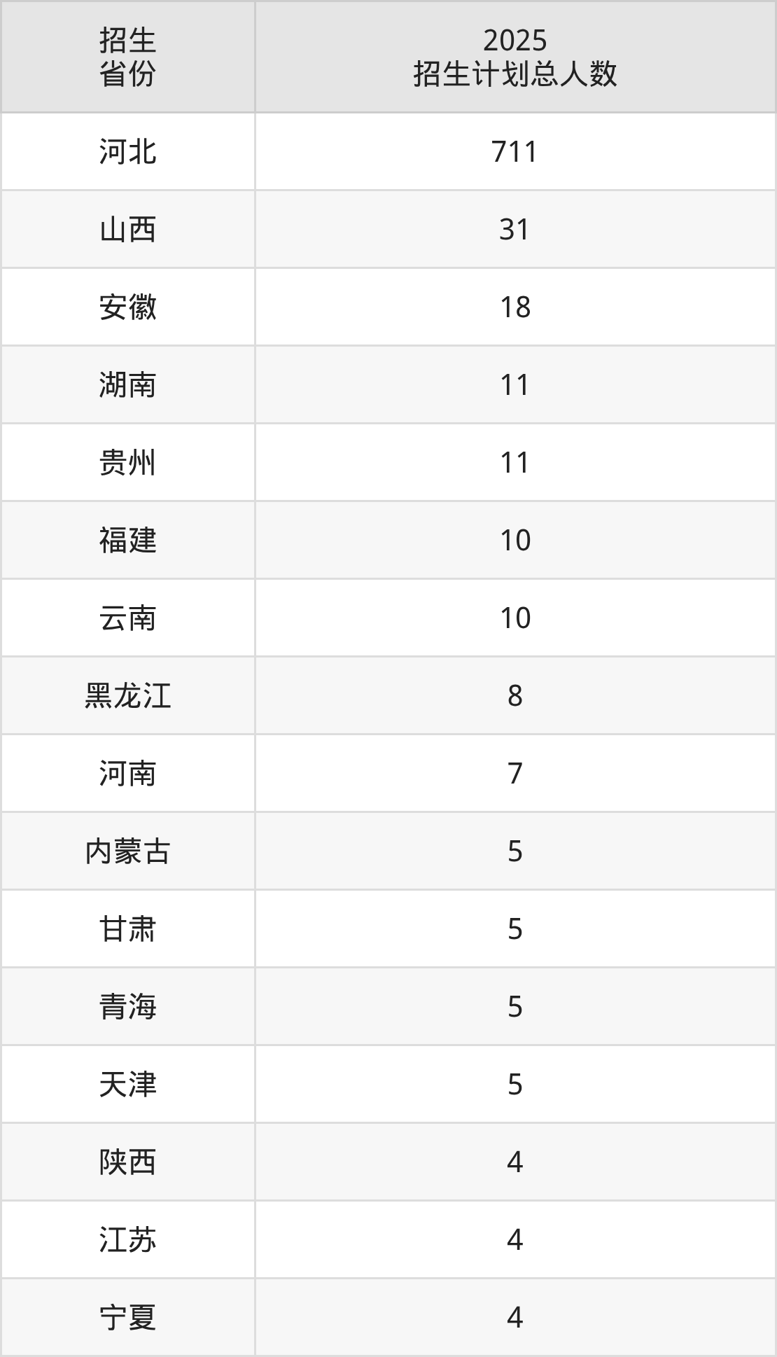 2025年河北交通職業(yè)技術(shù)學(xué)院面向全國23個省市開展??普猩?;招生專業(yè)共25個,招生人數(shù)共864人。2025年在河北省招生計劃總?cè)藬?shù)是711人,其中,河北交通職業(yè)技術(shù)學(xué)院在河北省招生人數(shù)最多的是道路與橋梁工程技術(shù)。河北交通職業(yè)技術(shù)學(xué)院在各省具體招生人數(shù)情況如下表。