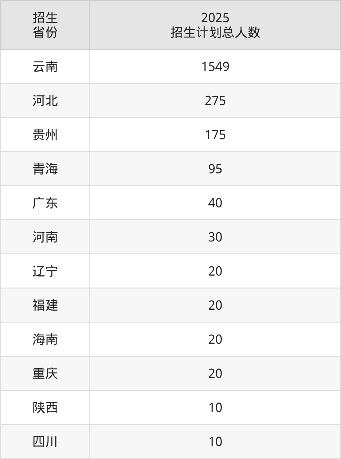 2025年云南商務職業(yè)學院面向全國12個省市開展??普猩?;招生專業(yè)共36個,招生人數(shù)共2264人。2025年在云南省招生計劃總人數(shù)是1549人,其中,云南商務職業(yè)學院在云南省招生人數(shù)最多的是人工智能數(shù)據(jù)工程技術。云南商務職業(yè)學院在各省具體招生人數(shù)情況如下表。